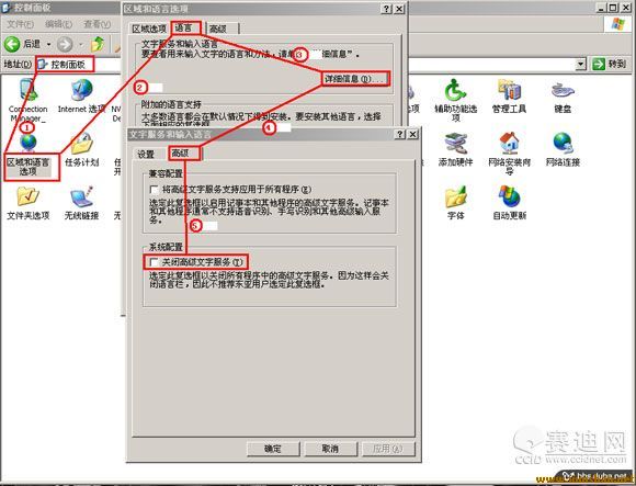 3.依次打開【控制面板】——【區(qū)域和語言選項(xiàng)】——【語言】——【詳細(xì)信息】——【高級(jí)】——去掉“關(guān)閉高級(jí)文字服務(wù)”前的小勾。如圖所示: