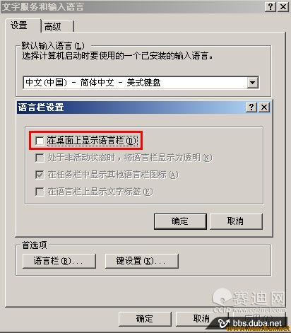 5.如桌面右下腳依然沒有語言欄圖標(biāo)的話,檢查【語言欄設(shè)置】中是否勾選了在桌面上顯示。如圖所示: